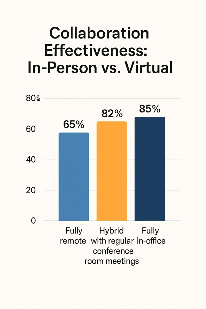 Research consistently shows that hybrid teams using physical meeting spaces at least once per quarter report higher trust and faster project completion. Physical environments enhance engagement because they recreate what remote setups lack: unplanned connection and tangible focus.